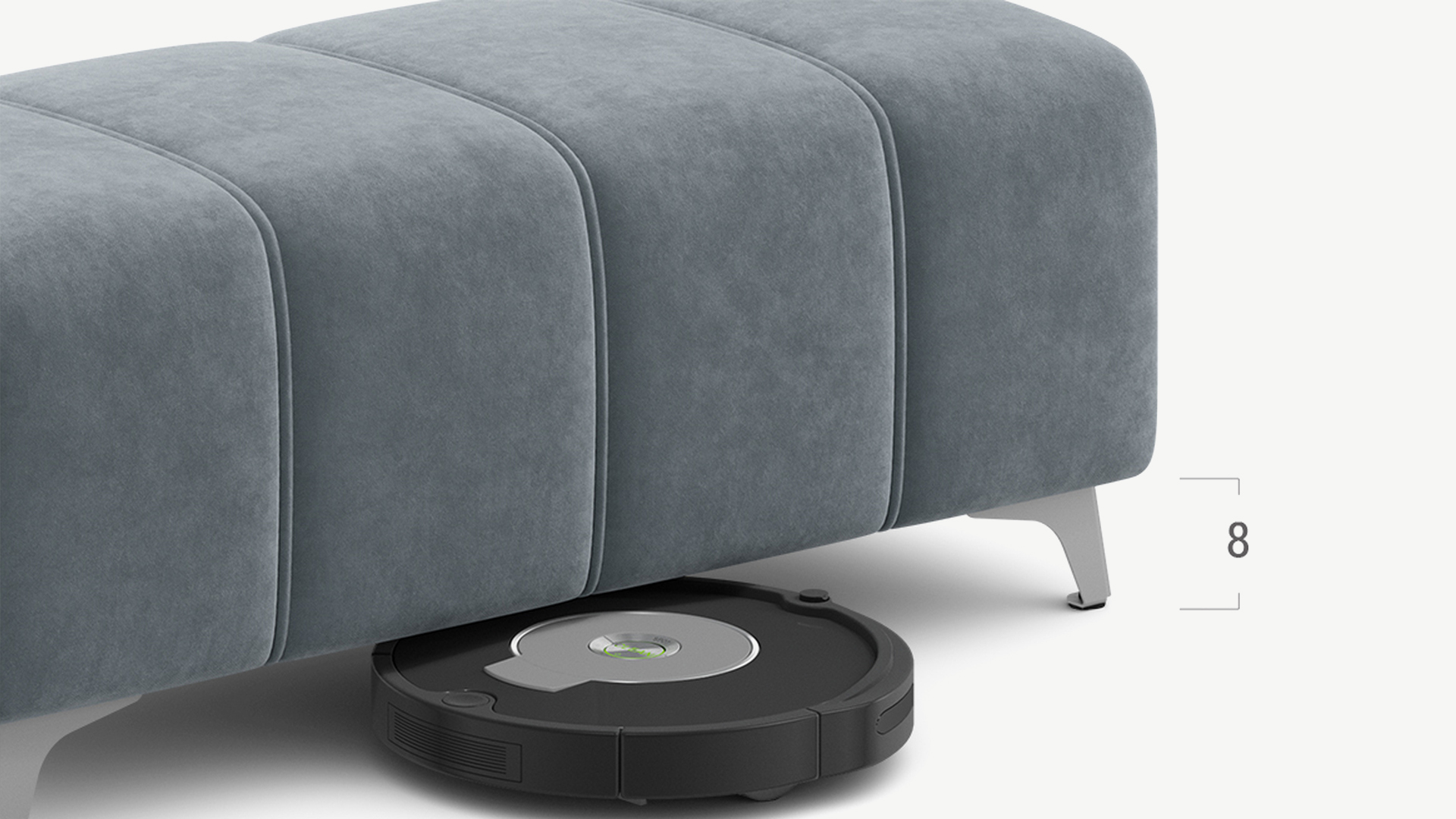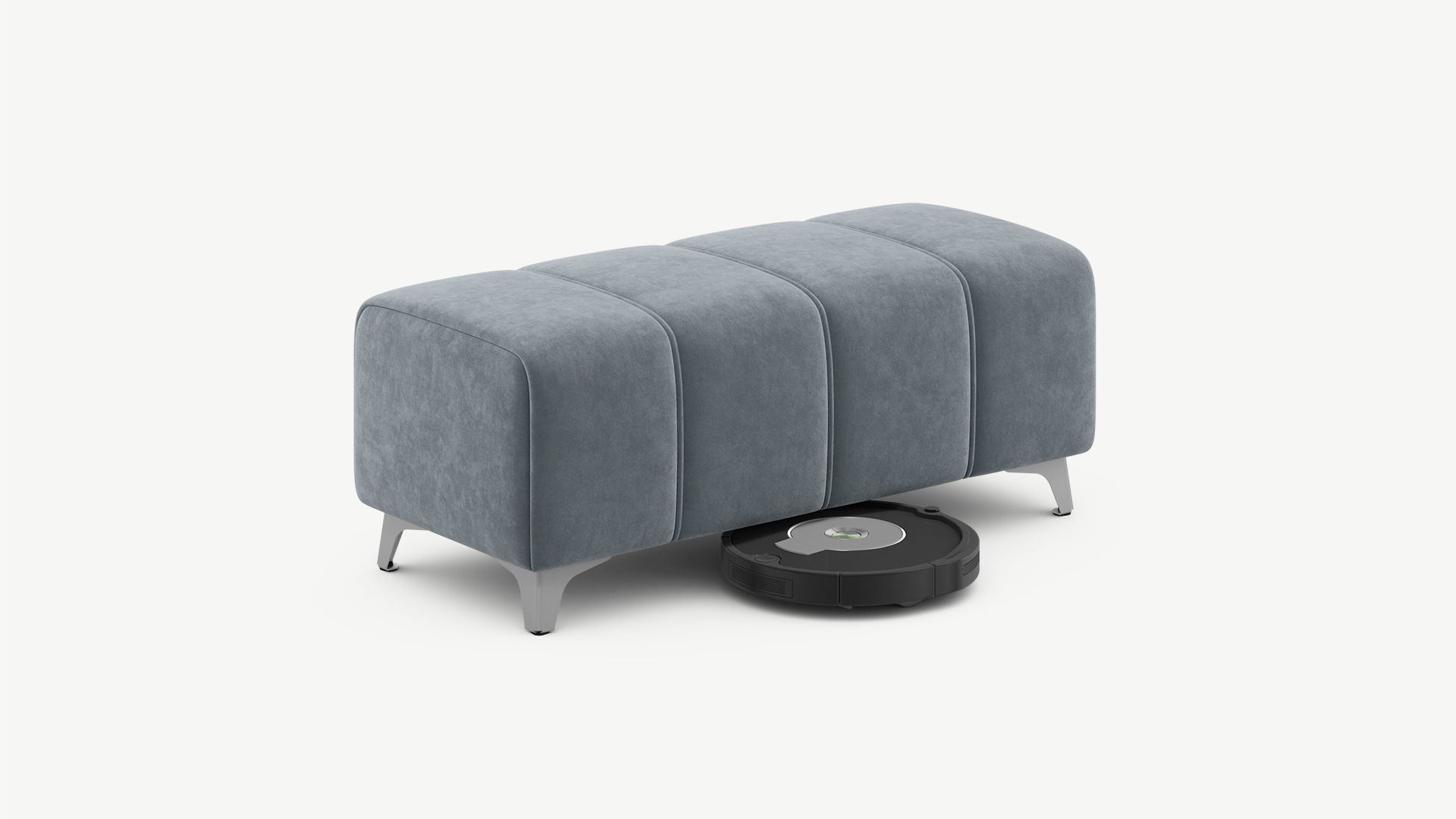 Под банкеткой с высокими фигурными опорами проходит робот-пылесос.