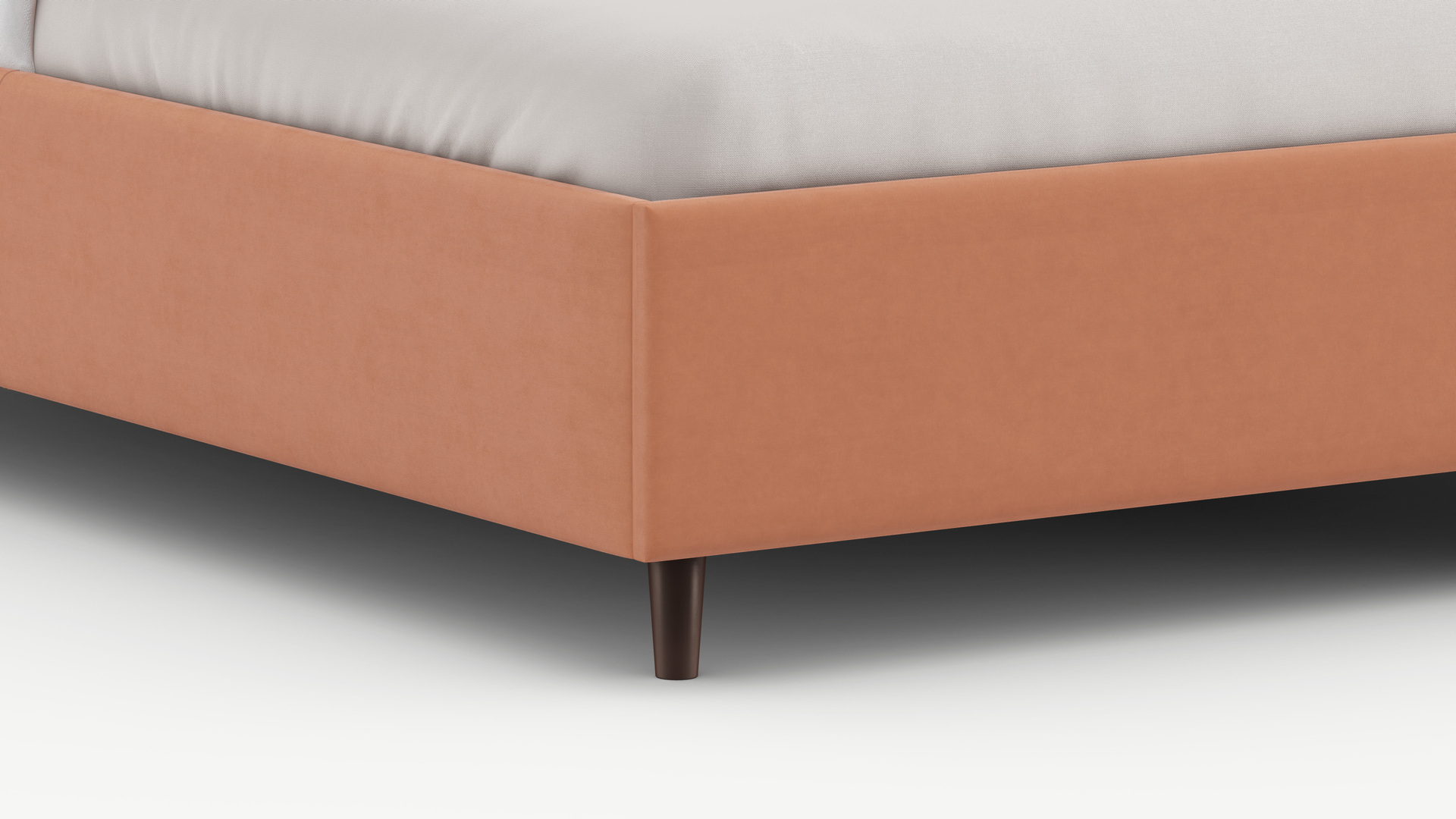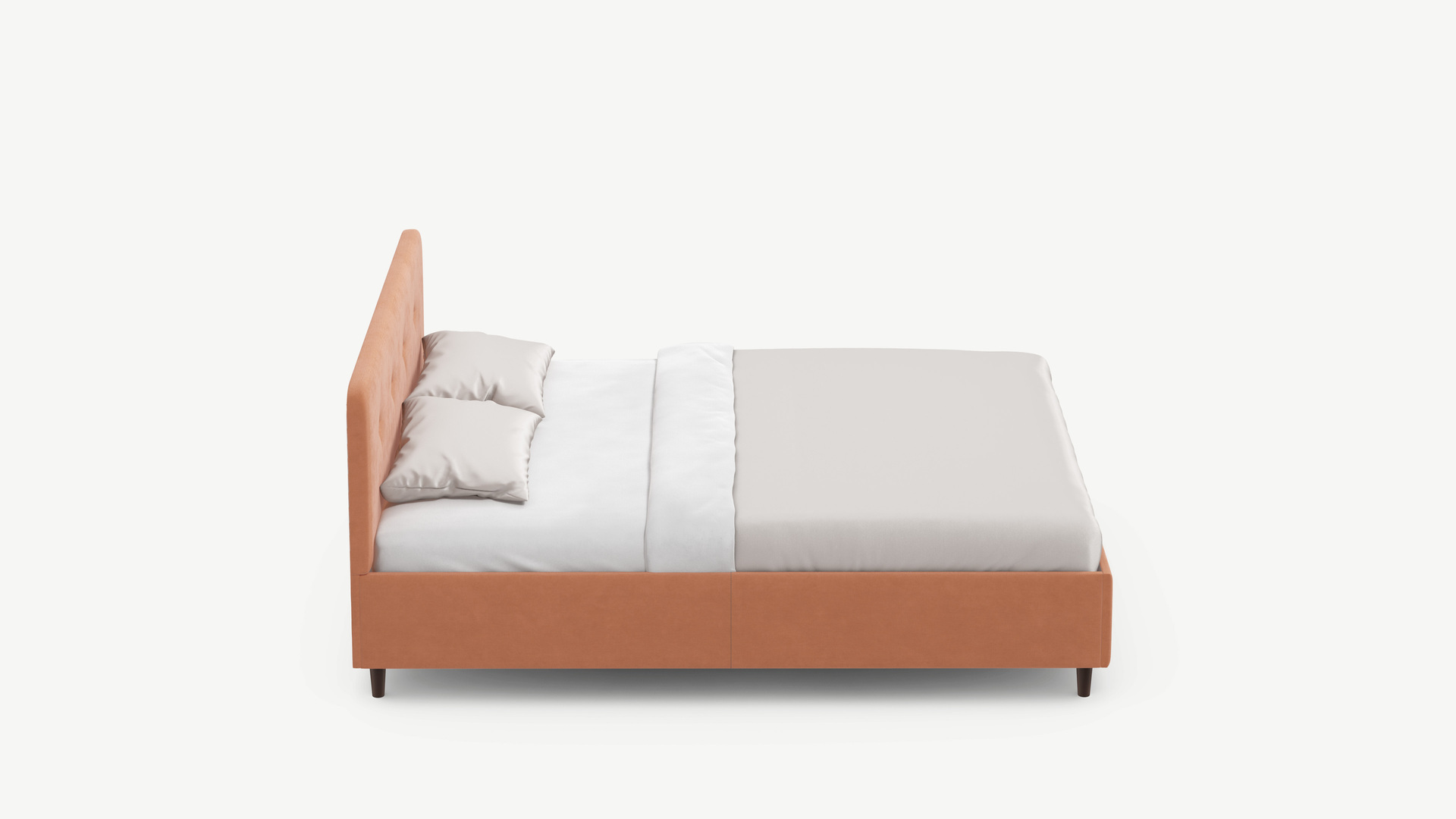 Царга, задающая пропорции, благодаря гладкости своей фактуры подчеркивает центральный элемент декора. Высокие опоры приподнимают фигуру кровати над полом и добавляют её образу визуальной легкости.