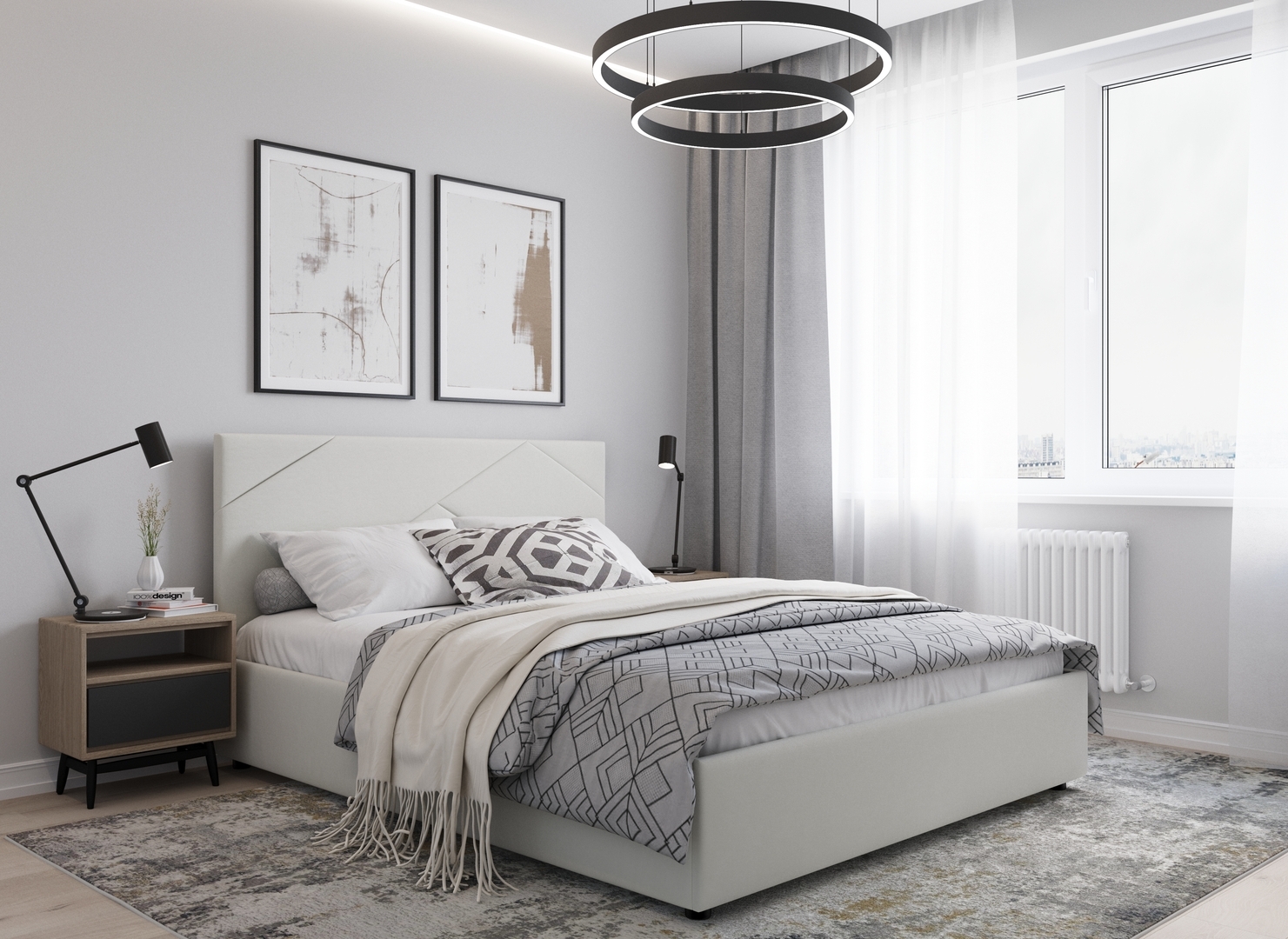 MOON FAMILY 1257 привлекает внимание оригинальным исполнением: широкие полосы ткани эффектно пересекают периметр изголовья, создавая на нем графический орнамент. Элегантным и практичным акцентом служат скрытые карманы, расположенные по его углам. Лаконичные формы объемных царг создают единый гармоничный образ и фокусируют внимание на центральном текстурном элементе кровати.