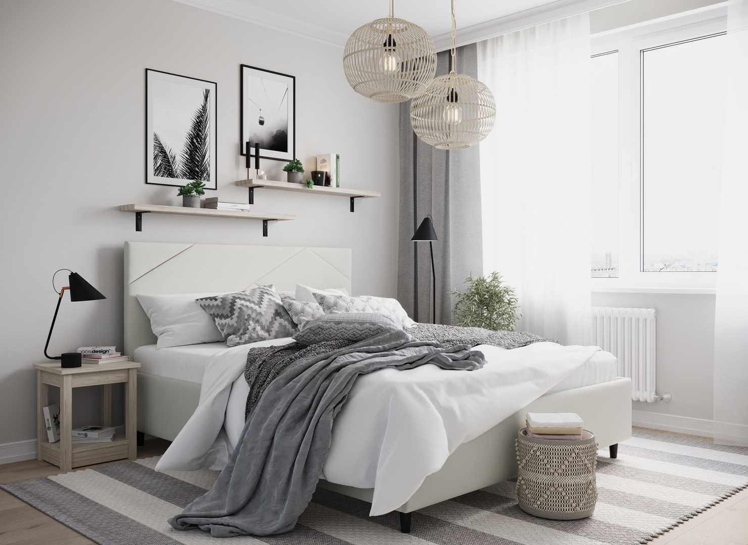 Создать гармоничный интерьер и завершить образ спальни помогут дополнительные аксессуары, например: тумбы, банкетки, подушки.