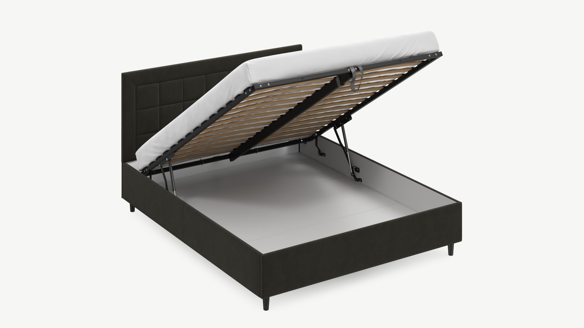 • Скрытая под основанием вместительная емкость без внутренних перегородок позволяет использовать всю площадь подкроватного пространства для хранения вещей.