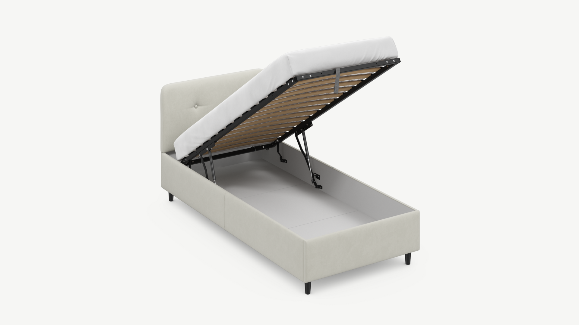 • Скрытая под основанием вместительная емкость без внутренних перегородок позволяет использовать всю площадь подкроватного пространства для хранения вещей.