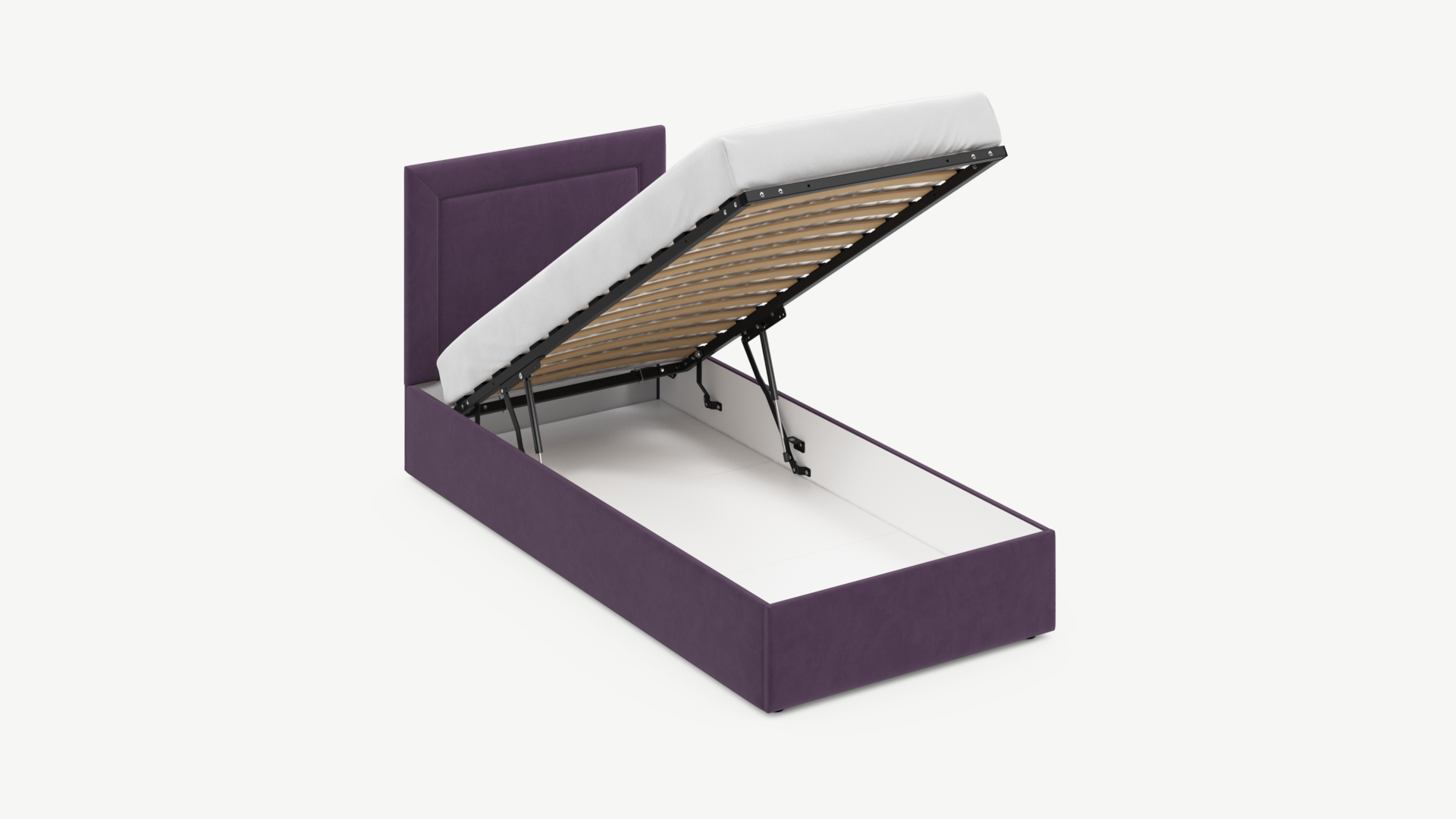 Вместительная емкость под кроватью без внутренних перегородок позволяет использовать для хранения вещей 100% пространства.