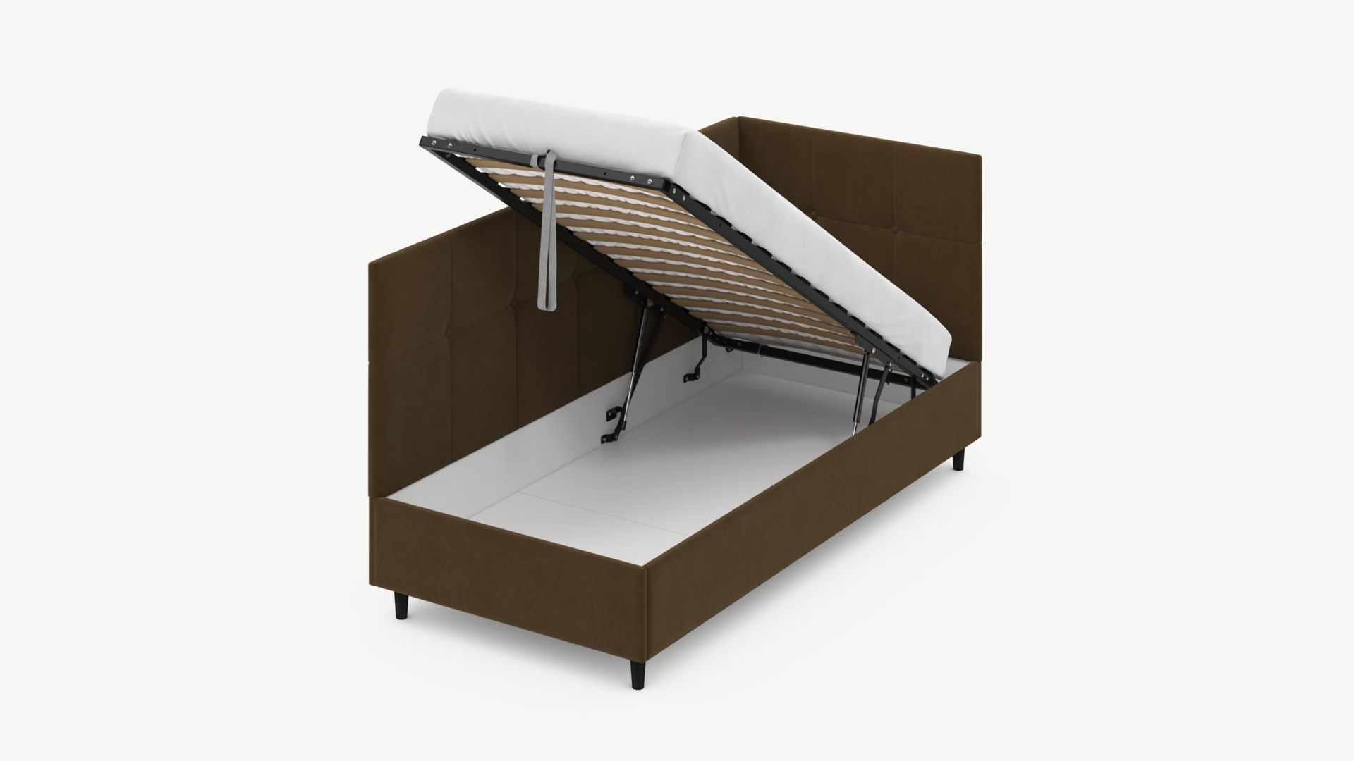 • Скрытая под основанием вместительная емкость без внутренних перегородок позволяет использовать всю площадь подкроватного пространства для хранения вещей.
