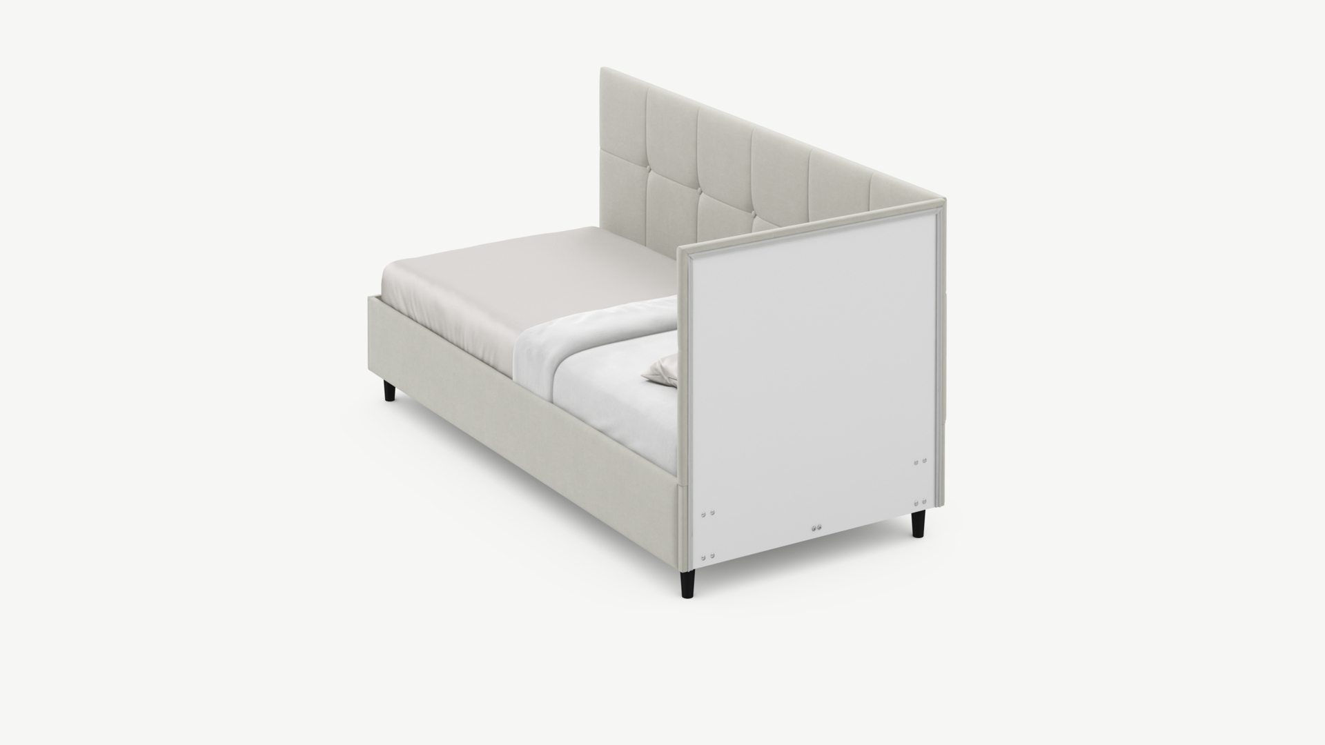 Угловая односпальная кровать MOON FAMILY 1261 с мягкой спинкой и изголовьем создаст в Вашей спальне ощущение уюта. Крупная квадратная стежка привносит в интерьер графических акцентов, а вставка из пуговиц наполняет пространство ощущением домашнего тепла.