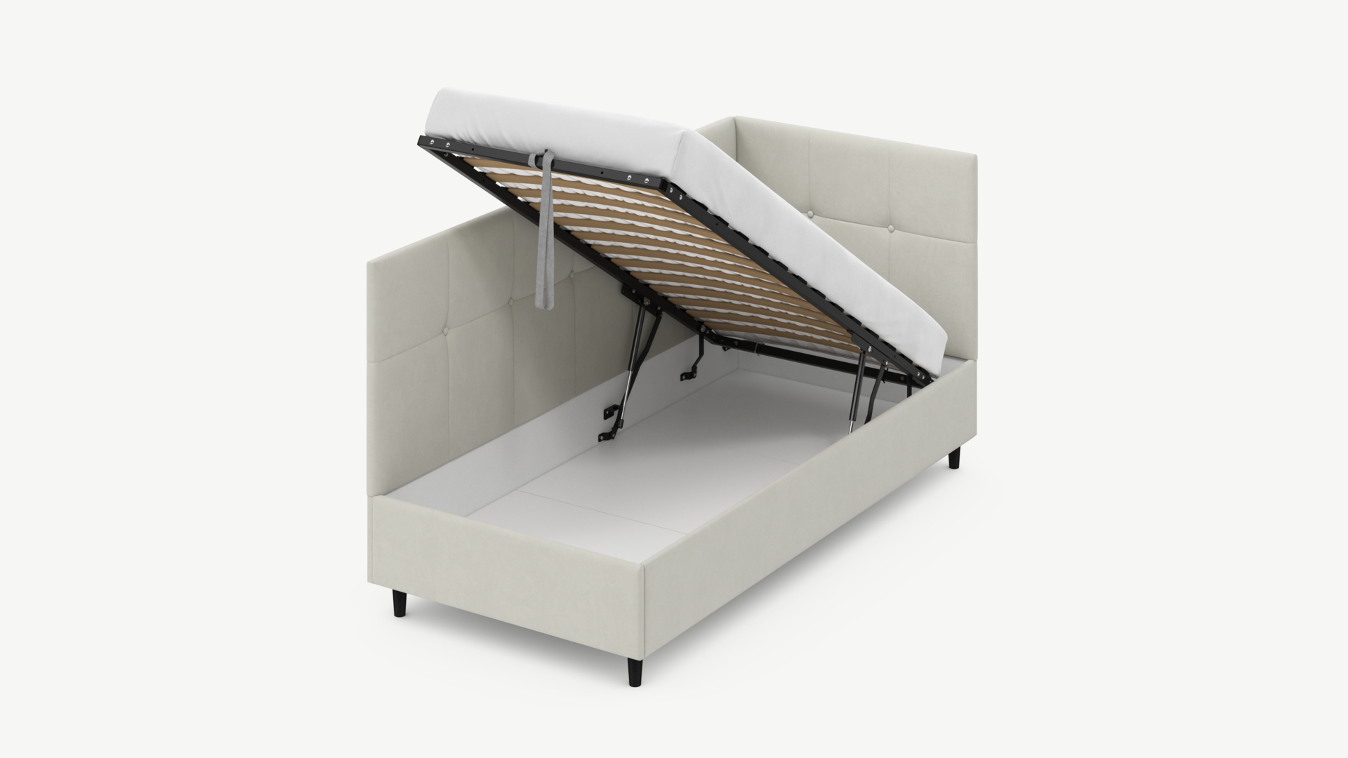 • Скрытая под основанием вместительная емкость без внутренних перегородок позволяет использовать всю площадь подкроватного пространства для хранения вещей.