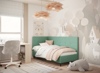 Угловая односпальная кровать MOON FAMILY 1261 с мягкой спинкой и изголовьем создаст в Вашей спальне ощущение уюта. Крупная квадратная стежка привносит в интерьер графических акцентов, а вставка из пуговиц наполняет пространство ощущением домашнего тепла.