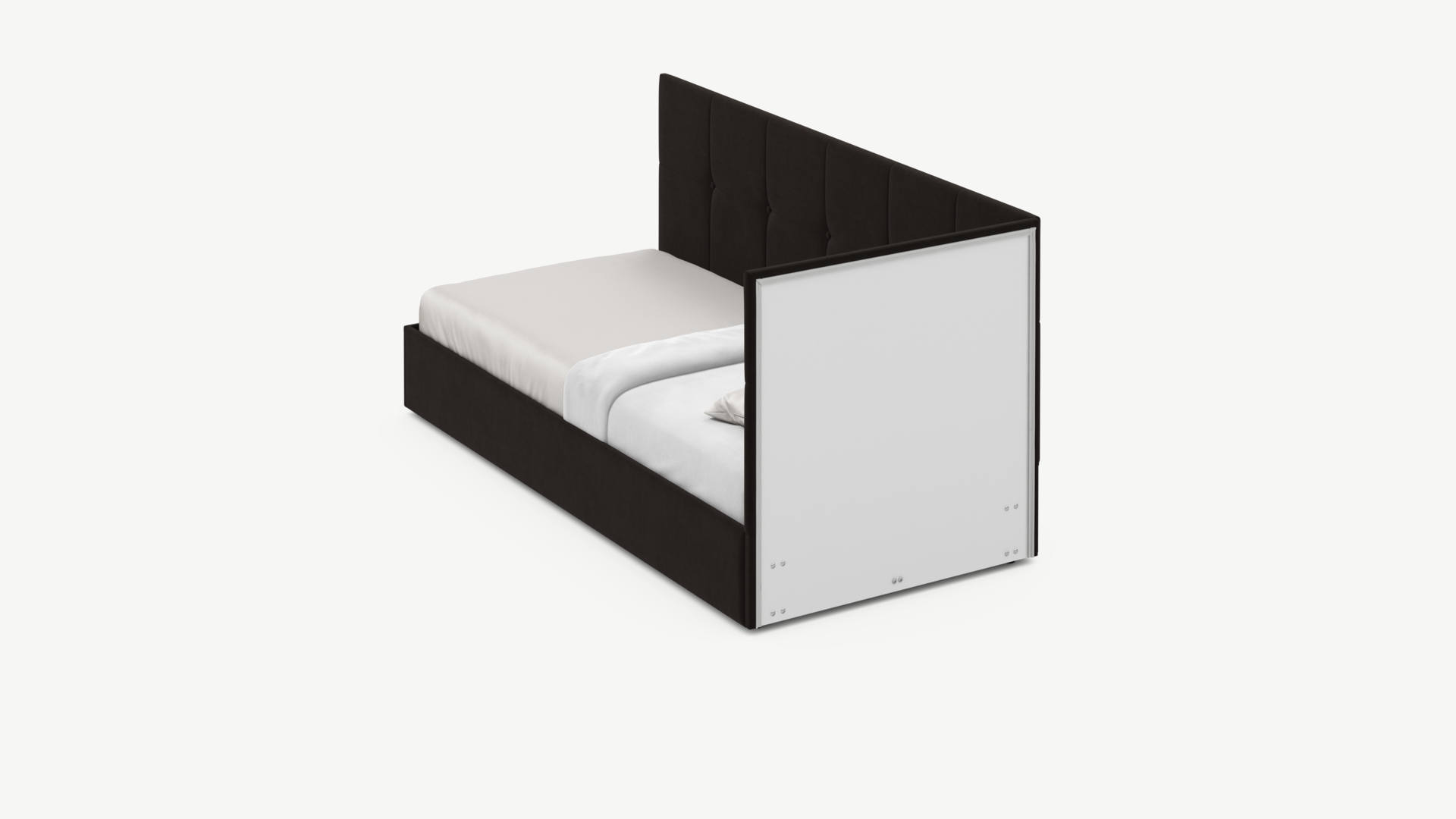 Угловая односпальная кровать MOON FAMILY 1261 с мягкой спинкой и изголовьем создаст в Вашей спальне ощущение уюта. Крупная квадратная стежка привносит в интерьер графических акцентов, а вставка из пуговиц наполняет пространство ощущением домашнего тепла.
