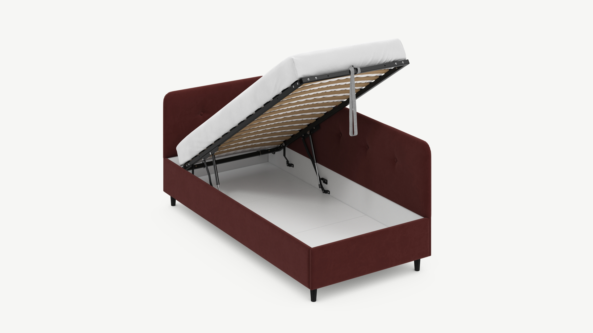 • Регулируемый подъемный механизм имеет два положения установки газовых амортизаторов в зависимости от веса матраса. Это дает возможность оптимально подстраивать угол подъема основания, а также плавно и бесшумно поднимать и опускать спальное место.