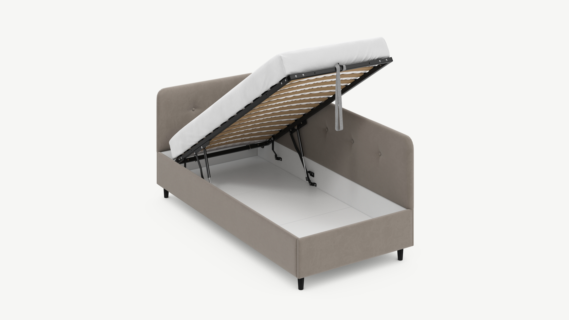 • Регулируемый подъемный механизм имеет два положения установки газовых амортизаторов в зависимости от веса матраса. Это дает возможность оптимально подстраивать угол подъема основания, а также плавно и бесшумно поднимать и опускать спальное место.